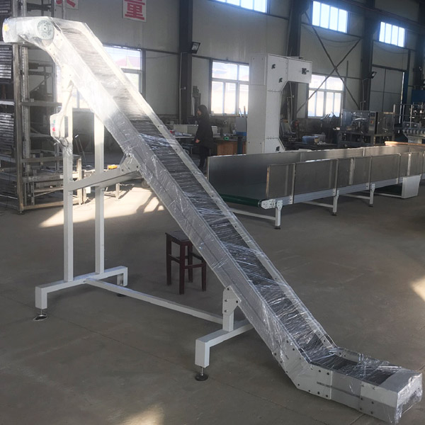 爬坡鏈板輸送機(jī)采用特制的推板,使得物料在向上或向下輸送時(shí),不會(huì)沿鏈板下滑。適用于大傾角輸送物料。如空間及物品形狀允許,可代替連續(xù)提升機(jī)使用。它是在鏈?zhǔn)捷斔蜋C(jī)的兩側(cè)鏈條間加裝板式構(gòu)件,以達(dá)到輸送型態(tài)不規(guī)則的物品,在鏈板上加裝專用工裝夾具,并根據(jù)工控要求可作為裝配線,或直接采用塑鋼平頂鏈或不銹鋼平頂鏈作為輸送載體。